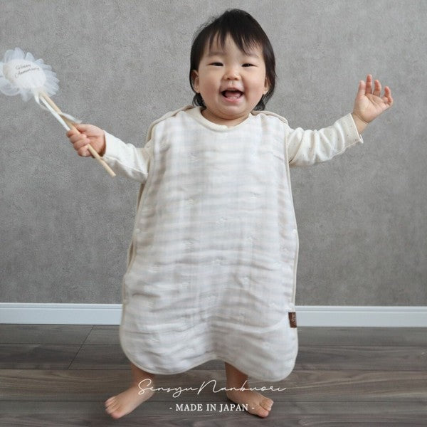 This 4-layer gauze sleeper is made with 100% cotton fabric that is gentle on your baby's skin. The fabric is produced with care in Osaka, the birthplace of Japanese towels. The gauze is fluffy and soft to the touch, and its lightweight and breathable nature make it perfect for summer.