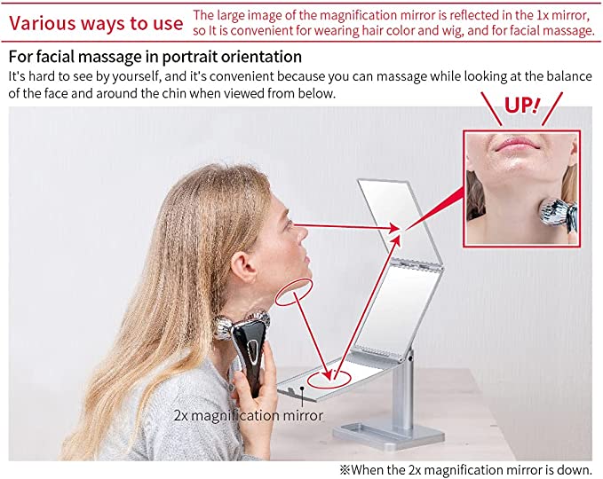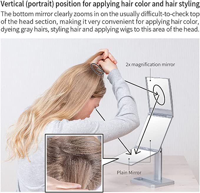 HORIUCHI MIRRORは、くすみの原因となる鉄分をより多く取り除いた透明度の高いガラスと、色の再現性が高い反射金属との組み合わせにより、本来の姿をありのままに映し出す日本で特許を取得した鏡です。肌の色が鮮明に映ることで、自分に合ったファンデーションの色味がわかり、メイクの仕上がりが格段よくなるため、美容業界のプロの方々にも支持されています。 スタイリングスタンドミラーは、様々な角度から自分を確認できるヘアスタイリングとメイクアップ用の3面鏡です。 特徴1 3面鏡の1面が2倍拡大鏡になっていて、頭頂部・つむじを大きく拡大して確認することができます。 特徴2 用途に合わせて鏡の向きを縦・横と360度回転することができます。 特徴3 見やすい角度に鏡の角度を自由に傾けることができます。 特徴4 鏡の高さを10.5センチ調整できます。 使い方 ①縦使いでヘアカラー・ヘアスタイリングに 3面鏡の下の鏡に普段見づらい頭頂部が大きくはっきり映せます。頭頂部のヘアカラーや白髪染め 、ヘアスタイリングやウィッグの装着に大変便利です。 ②横使いで襟足部分のヘアカラーに 左右の鏡に普段見づらい襟足部分が大きくはっきり映せるので、襟足部分の白髪染めするのに大変便利です。 ③横向きでメイクアップやお肌のチェックに 等倍鏡の正面で全体のチェック、ちらっと横を見れば拡大鏡で細部がチェックできます。簡単に見比べられるので入念なチェックが繰り返しできます。 サイズ 横使用時 幅175×奥行き140×高さ255(mm )伸縮時高さ360mm 縦使用時 幅160×奥行き140×高さ265(mm)伸縮時高さ370mm 重量約750g 素材 ABS樹脂・ガラスミラー 日本製