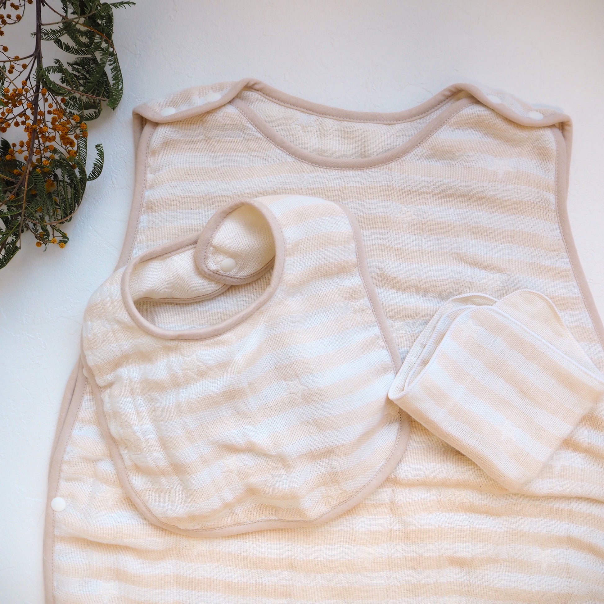 4層構造のガーゼ生地を使用したスリーパー、スタイ、ハンカチが入ったオリジナルギフトボックスです。 プリントではなく織で表現をしたナチュラルなボーダースター柄は男女問わず可愛らしいデザイン。 デリケートな肌の赤ちゃんに合わせて、コットンを100%使用し柔らかくふっくらと織り上げております。 ガーゼ生地は吸水性に優れており、汗っかきな赤ちゃんの肌を常に優しく包み込みます。 出産準備や出産祝いとしてもピッタリなギフトボックスです。