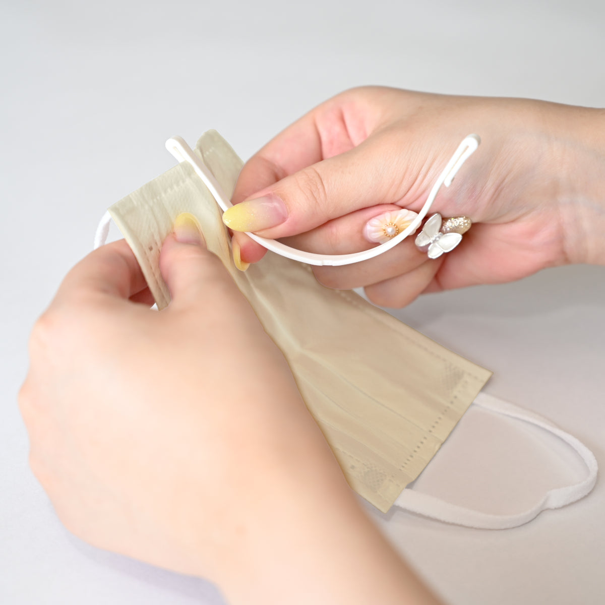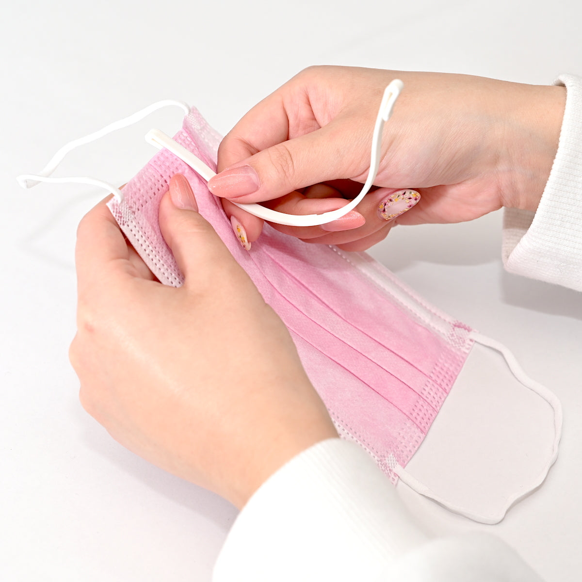マスクの両端にフックを差し込むだけで確実に取り付けられます。