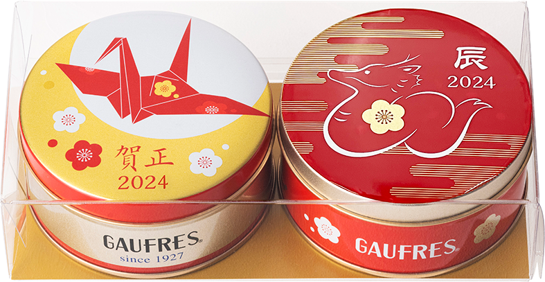 干支と賀正、2種類の缶を詰め合わせました。2024年の干支「辰」と「折り鶴」が新年を言祝ぎます。