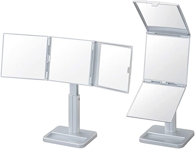 HORIUCHI MIRRORは、くすみの原因となる鉄分をより多く取り除いた透明度の高いガラスと、色の再現性が高い反射金属との組み合わせにより、本来の姿をありのままに映し出す日本で特許を取得した鏡です。肌の色が鮮明に映ることで、自分に合ったファンデーションの色味がわかり、メイクの仕上がりが格段よくなるため、美容業界のプロの方々にも支持されています。 スタイリングスタンドミラーは、様々な角度から自分を確認できるヘアスタイリングとメイクアップ用の3面鏡です。 特徴1 3面鏡の1面が2倍拡大鏡になっていて、頭頂部・つむじを大きく拡大して確認することができます。 特徴2 用途に合わせて鏡の向きを縦・横と360度回転することができます。 特徴3 見やすい角度に鏡の角度を自由に傾けることができます。 特徴4 鏡の高さを10.5センチ調整できます。 使い方 ①縦使いでヘアカラー・ヘアスタイリングに 3面鏡の下の鏡に普段見づらい頭頂部が大きくはっきり映せます。頭頂部のヘアカラーや白髪染め 、ヘアスタイリングやウィッグの装着に大変便利です。 ②横使いで襟足部分のヘアカラーに 左右の鏡に普段見づらい襟足部分が大きくはっきり映せるので、襟足部分の白髪染めするのに大変便利です。 ③横向きでメイクアップやお肌のチェックに 等倍鏡の正面で全体のチェック、ちらっと横を見れば拡大鏡で細部がチェックできます。簡単に見比べられるので入念なチェックが繰り返しできます。 サイズ 横使用時 幅175×奥行き140×高さ255(mm )伸縮時高さ360mm 縦使用時 幅160×奥行き140×高さ265(mm)伸縮時高さ370mm 重量約750g 素材 ABS樹脂・ガラスミラー 日本製