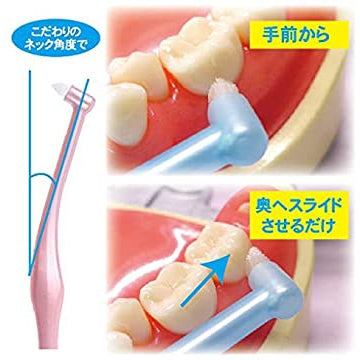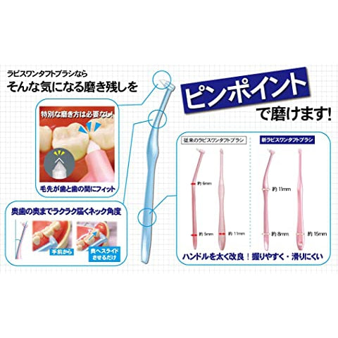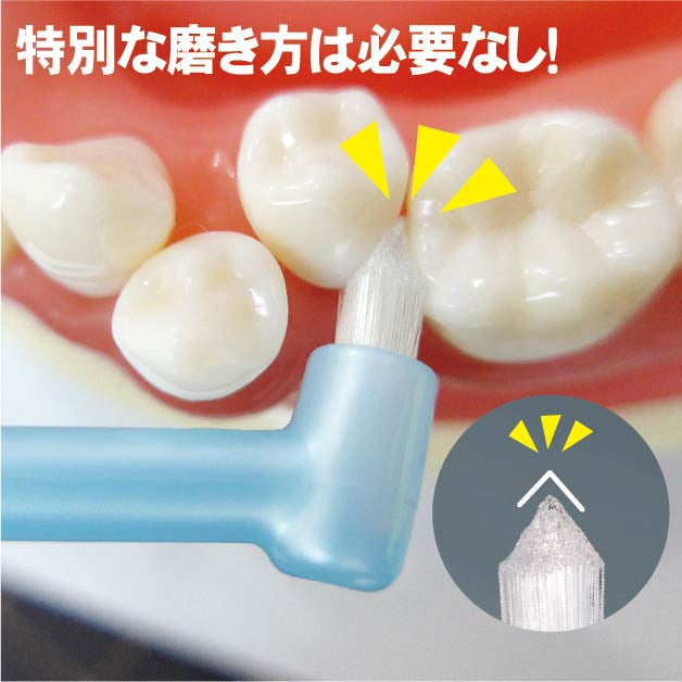 世界のトップメーカー、デュポン社製の高品質ナイロン毛を使用しています。毛のカット具合やハンドル・ヘッドの角度など、歯科医院様と共に考えたワンタフトです。歯間部分、矯正部分の清掃に優れています。奥歯までしっかり届きます。お子様の細部の仕上げ磨きにも使っていただけます。