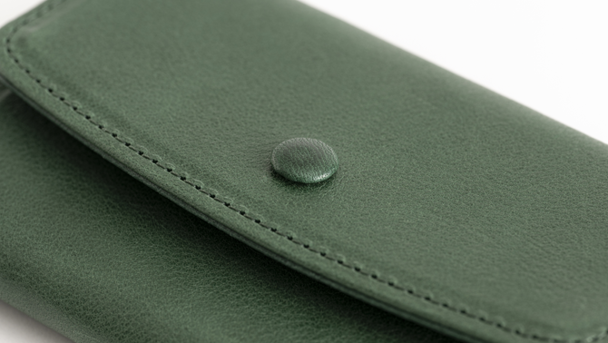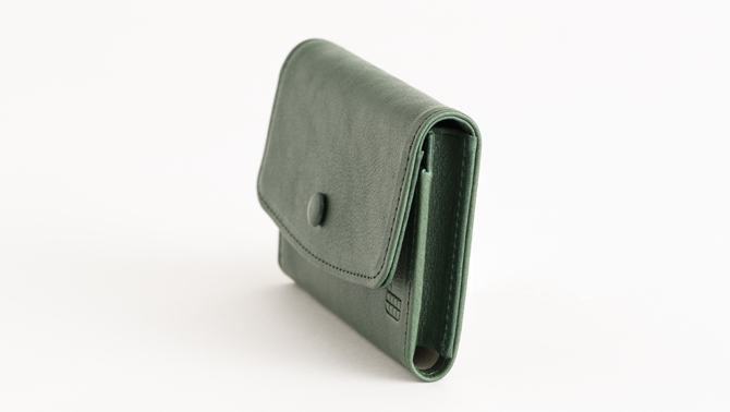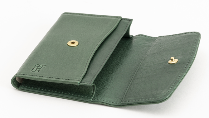 留め具を革で包んだクルミボタンが特徴的な名刺入れ。