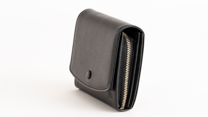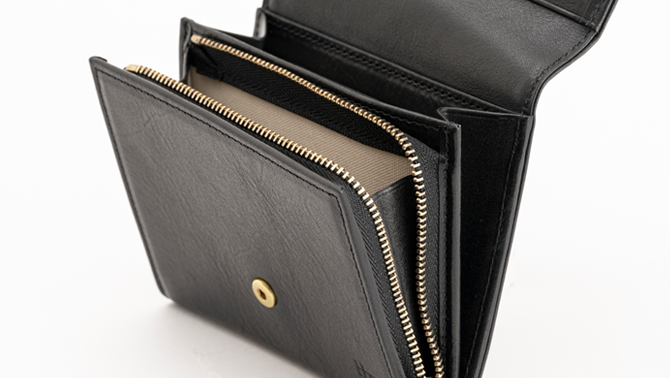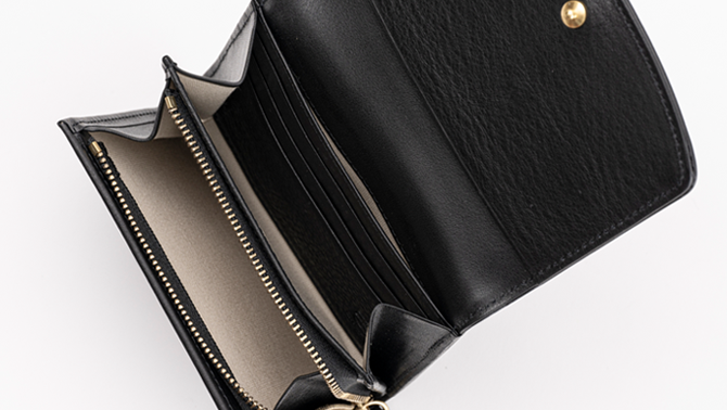 留め具を革で包んだクルミボタンが特徴的な財布。